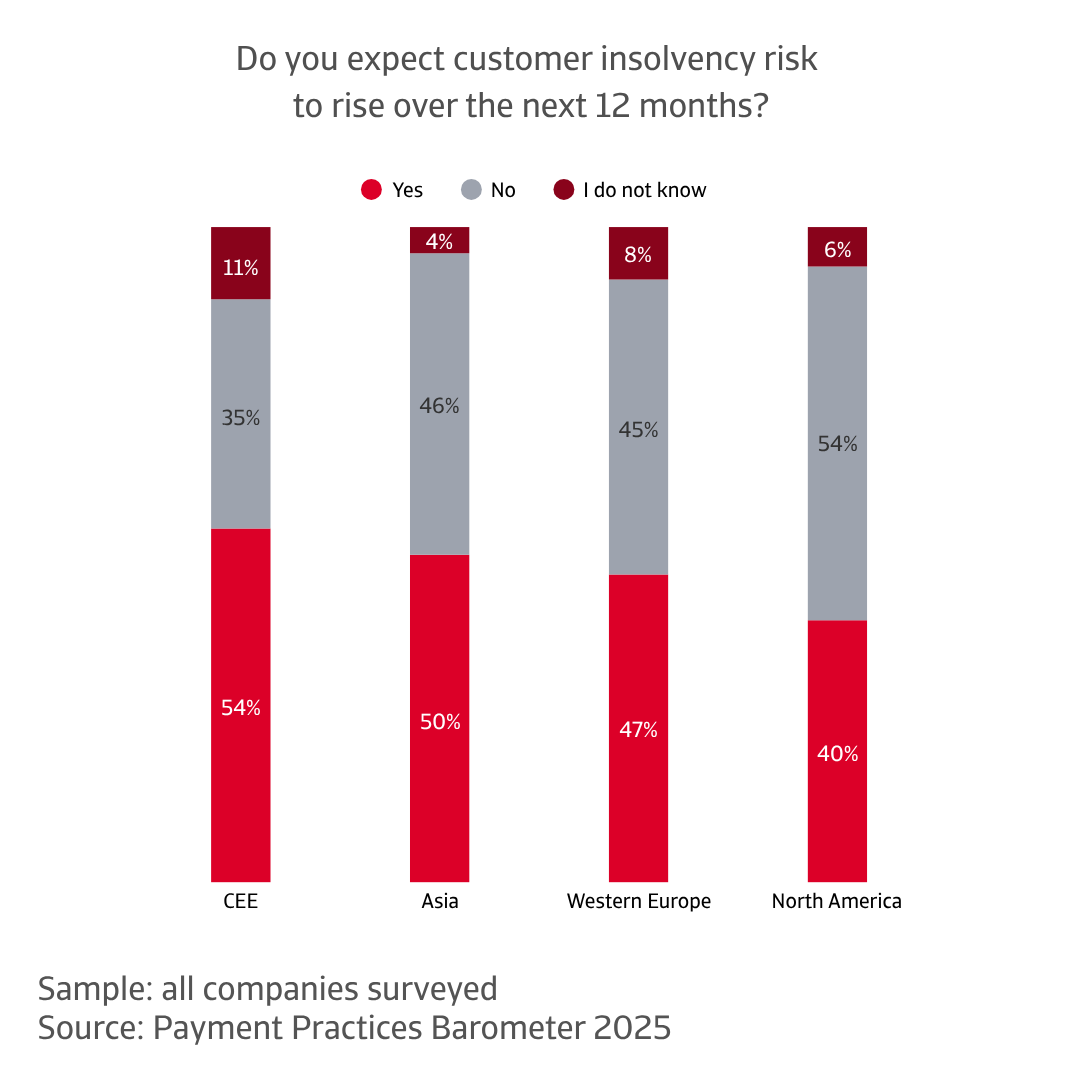 Nell'Europa occidentale, le aspettative sono più contrastanti. Alcune aziende ritengono che le condizioni attuali possano mantenersi stabili, mentre altre si preparano a un deterioramento, riflettendo l'incertezza economica della regione. Nell'Europa centrale e orientale, la preoccupazione è più marcata. Le aziende della regione sono particolarmente diffidenti nei confronti di un potenziale aumento dei casi di insolvenza, data la loro esposizione alle difficoltà globali e la necessità di una solida gestione del rischio.