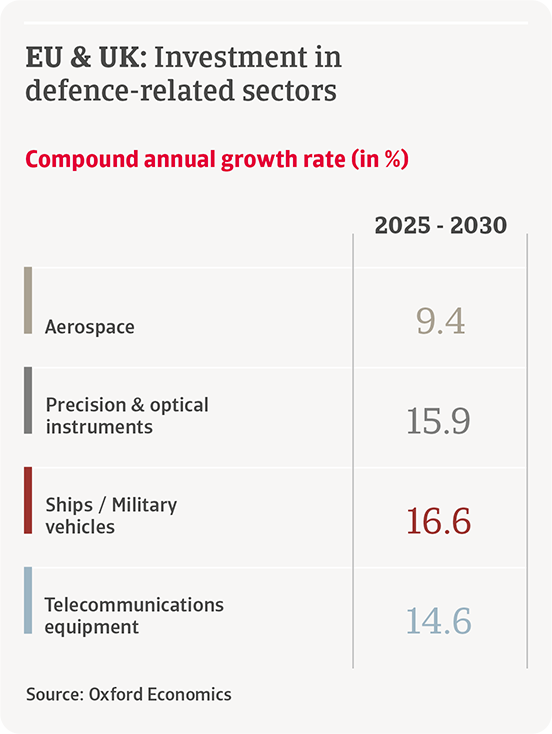 Despite misgiving around the extent of any manufacturing upturn, there will clearly be winners from Europe’s race to rearm. A concentrated subset of capital-intensive sectors will see the biggest output growth over the next five years. They include ships and military vehicles, aerospace, precision and optical instruments and telecom equipment. Compared to manufacturing, those sectors will see above average gross output growth in the coming five years in the EU and the UK.