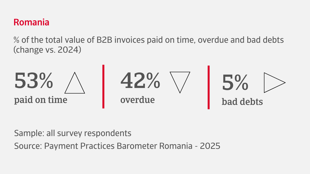 The payment behaviour of B2B customers has remained largely stable, and almost 50% of companies in Romania report no significant variation in recent months. However, this means that businesses accustomed to late payments continue to experience delays. Overdue invoices currently affect 42% of all sales transacted on credit, with ongoing liquidity constraints among B2B customers cited as the most common explanation. Bad debts average 5% of B2B invoices, although the steel and metals sector is facing a heavier burden.
