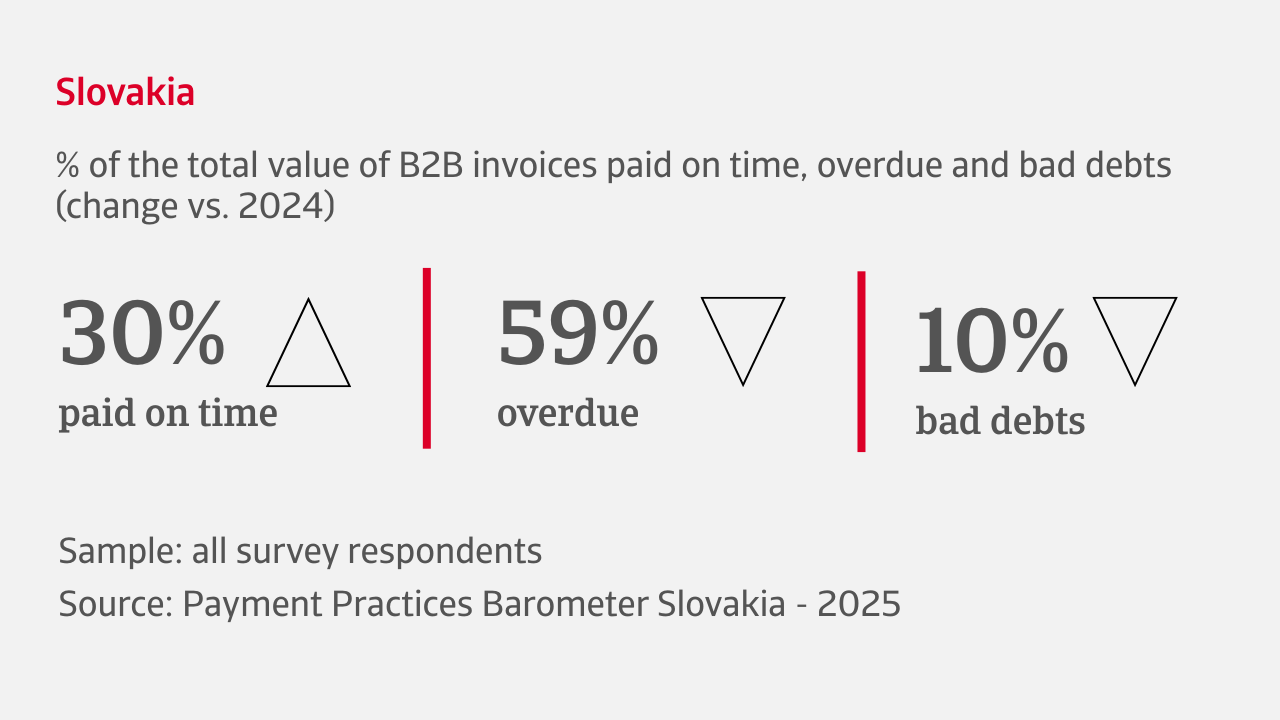 - Quasi due terzi delle vendite effettuate dalle aziende slovacche a credito nel commercio B2B negli ultimi mesi sono in ritardo di pagamento. Questo ritardo nei pagamenti sta causando notevoli difficoltà finanziarie alle imprese.