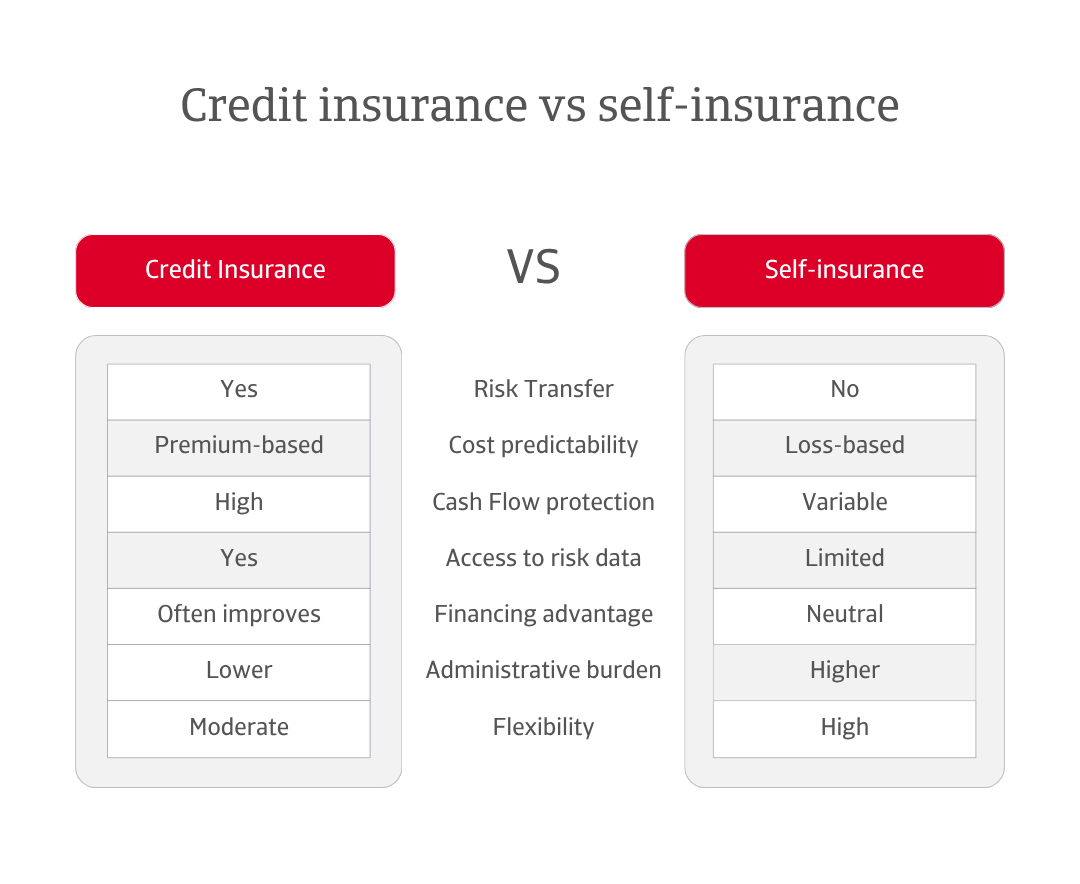 For most companies, especially those with a large or diverse customer base, exposure to high-risk markets, or a strategic focus on optimising working capital and stabilising cash flow, credit insurance is clearly the more robust and forward-looking solution. It not only transfers risk but also provides access to expert intelligence, enhances financing options, and reduces volatility in receivables. While self-insurance may suit firms with exceptionally strong internal credit controls and minimal exposure to default risk, it demands significant discipline and offers no external support when things go wrong. In today’s complex trade environment, relying solely on internal buffers is increasingly a strategic vulnerability rather than a strength.